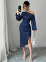 abyoxi 紫蓝色优雅不对称领口长袖腰部手工褶皱性感缎面连衣裙,适合约会、派对、简约、返校、秋冬女士服装