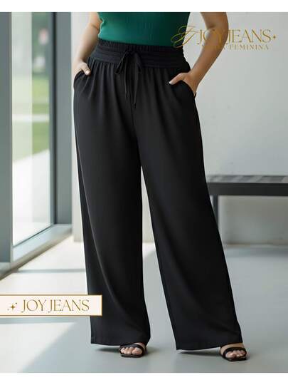 Women's Plus Size Wide Leg Pants, High Waist, Thick Elastic, Zero See-Through, Duna - 黑色 - 查看 1