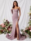 單肩褶邊高衩緞面正式連衣裙