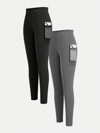SHEIN Girlism 2入組女孩針織純色高彈力打底褲,適用於日常休閒穿著