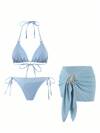 Swim Oasis 2025 休闲度假细肩带三角上衣、侧系带三角下装和长网纱裙女式三件套泳衣比基尼套装