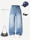 青少年女孩宽松水洗蓝色牛仔阔腿牛仔裤,休闲百搭,适合日常穿着和上学