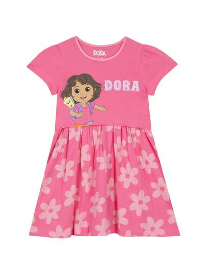 DORA 女孩連身裙,純棉夏季連身裙,短袖女孩連身裙,純棉連身裙 - 粉色 - 查看 1