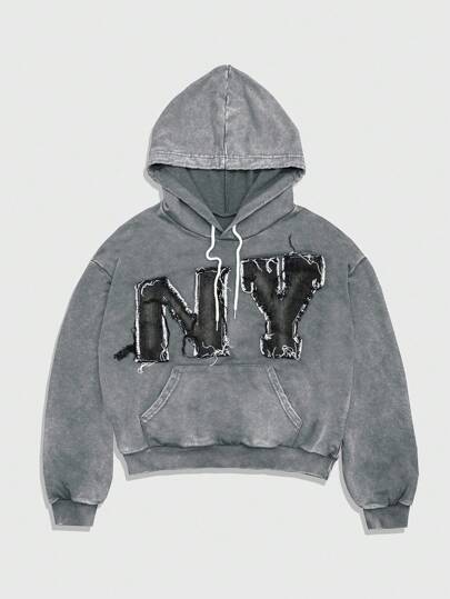 ROMWE MEN Street Life 男式字母贴花长袖抽绳连帽口袋运动衫 - 灰色 - 查看 1