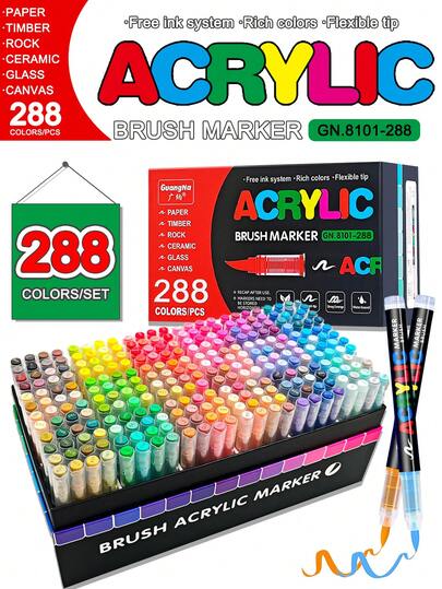 广纳 288 色丙烯颜料马克笔液体墨水套装 - 专业不透明快干水性笔,适用于帆布绘画、岩石装饰、织物设计、木艺、玻璃和陶瓷 | 高级艺术家、工艺用品(带盒子)、男孩和女孩的返校礼物 - 彩色 - 查看 1