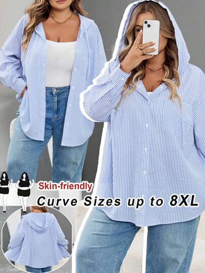SHEIN CURVE+ 大码女式宽松休闲条纹连帽衬衫,轻便外套,适合夏季、冬季女装,CURVE PLUS - 藍白色 - 查看 1