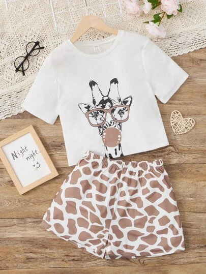 SHEIN 青少年女孩長頸鹿印花睡衣套裝 - 彩色 - 查看 1