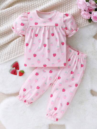 SHEIN 嬰兒女孩休閒家居套裝,短袖草莓印花上衣和長褲 - 淺粉色 - 查看 1
