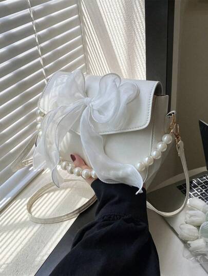 迷你方形包,人造珍珠和蝴蝶結裝飾,pvc Pu皮革斜挎包,女性奢侈肩袋手袋,白色 - 白色 - 查看 1