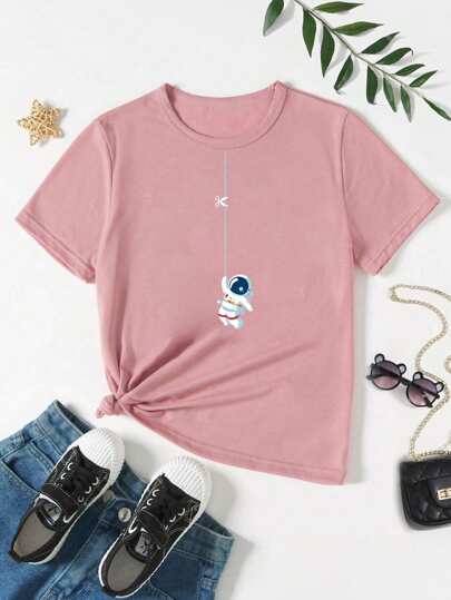 少女卡通太空人印花短袖T恤夏季款 - 粉色 - 查看 1