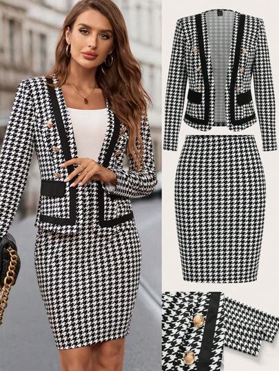 Ellevyn 女士Houndstooth拼色西裝外套和裙子套裝,金屬扣裝飾 - 黑與白 - 查看 1