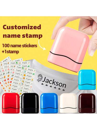 1 个印章 + 100 个姓名贴纸、儿童定制姓名签名印章、儿童返校用品、个性化姓名印章、DIY 定制自墨姓名印章、签名姓名印章、定制压花机、家居清新 - 粉色 - 查看 7