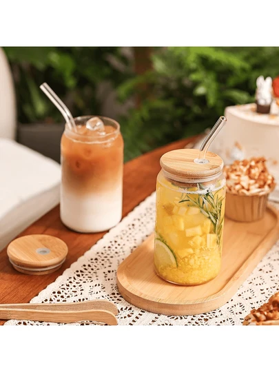 带盖和吸管的玻璃杯,梅森罐式冰咖啡杯,适用于茶、果汁、牛奶、生日礼物、饮具 - 玻璃杯 - 查看 1