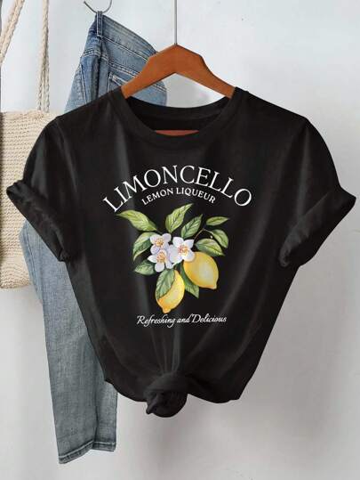 INAWLY 女士柠檬印花圆领短袖T恤图案T恤女式上衣 - 黑色 - 查看 1