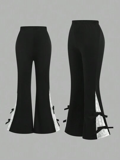 少女优雅高腰蕾丝拼布喇叭裤,带蝴蝶结细节,时尚甜美喇叭腿裤 - 黑色 - 查看 1