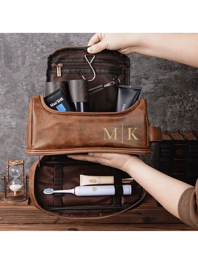 男士个性化真皮洗漱包/盥洗包/洗漱包,伴郎礼物,周年纪念礼物,旅行洗漱包,男士真皮配饰,挂式洗漱包,男士个性化真皮洗漱包,伴郎礼物,真皮剃须套装/盥洗包,伴郎礼物,圣诞礼物 - 棕色 - 查看 1