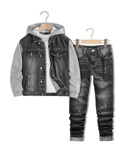 SHEIN 男童两件套时尚休闲黑色牛仔拼接灰色针织连帽长袖牛仔外套和舒适弹力修身儿童牛仔裤,适合日常穿着以及秋冬季儿童夏季服装 - 黑色 - 查看 1