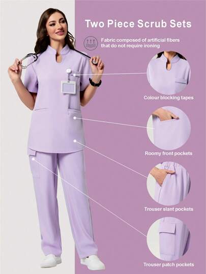 Scrubzie 2 件套女士磨砂制服,抗皱对比缝线短袖上衣和裤子 - 淡紫色 - 查看 2