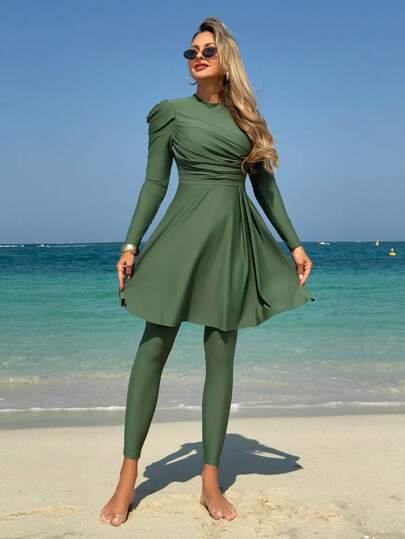 Swim Mulvari 女士纯色宽松长袖上衣和全长裤布基尼泳衣套装,海滩度假,夏季阿拉伯服装 - 墨綠色 - 查看 1