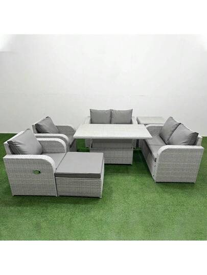 Fimous 7 Seater Outdoor Reclining Chair Love Sofa Set Rattan Garden Furniture Set With Adjustable Lifting Dining Or Coffee Table Footstool Side Table Light Grey - 淺灰色 - 查看 1