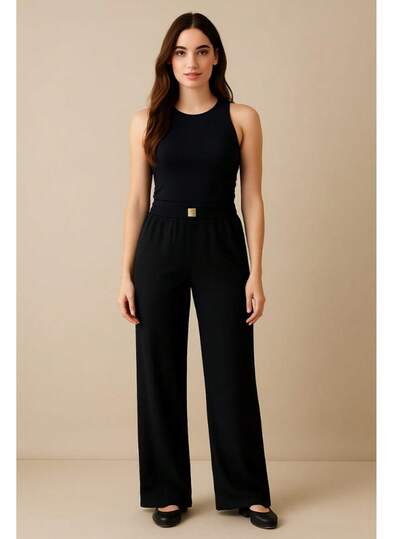 Wide Leg Pants Straight Cut Elastic Waist Comfortable Versatile Casual Fashion Dress - 黑色 - 查看 1