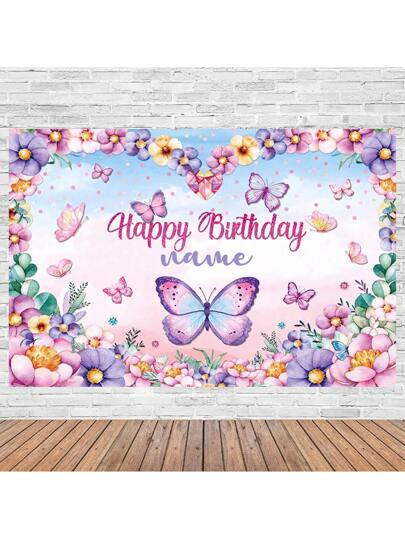 可定制个性化粉红紫色蝴蝶主题派对生日背景横幅,带有春天粉红花朵和蝴蝶生日派对主题可定制名称生日快乐适合生日,非常适合拍照亭和庆祝活动,夏季假期 - 白色 - 查看 7