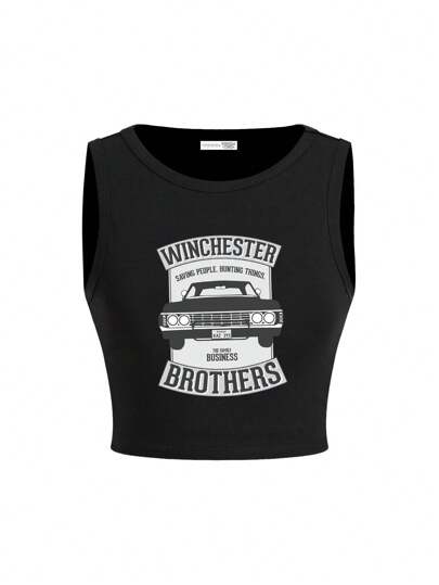 Supernatural X SHEIN 女式字母与汽车印花修身黑色背心 - 黑色 - 查看 1
