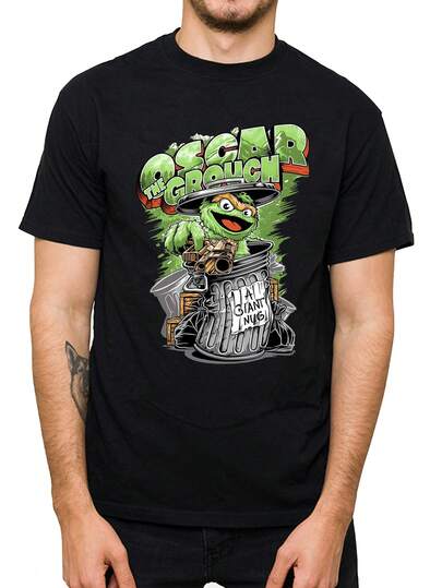 Oscar The Grouch Cartoon Printed Cotton T-Shirts Men Summer Casual Short Sleeved Tees - 黑色 - 查看 1