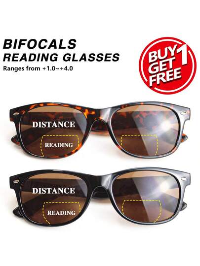2 件方形茶色双光老花镜,多功能镜片,铆钉镜腿设计,适合日常佩戴和户外 - 黑色+豹紋 - 查看 2