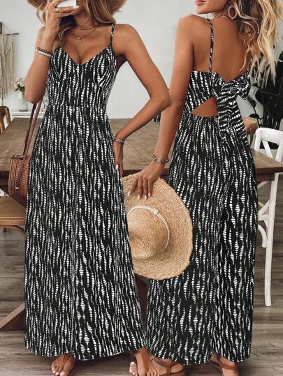 Breezaya 女式休闲无袖露背宽松碎花连体裤,春夏 - 黑色 - 查看 1
