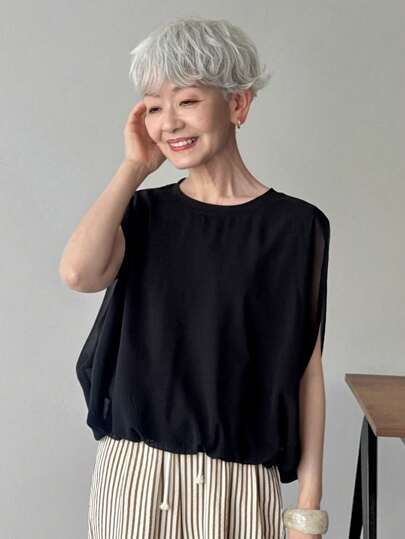 FRIFUL 女士雪纺拼接二合一短款休闲背心,夏季都市装 - 黑色 - 查看 1