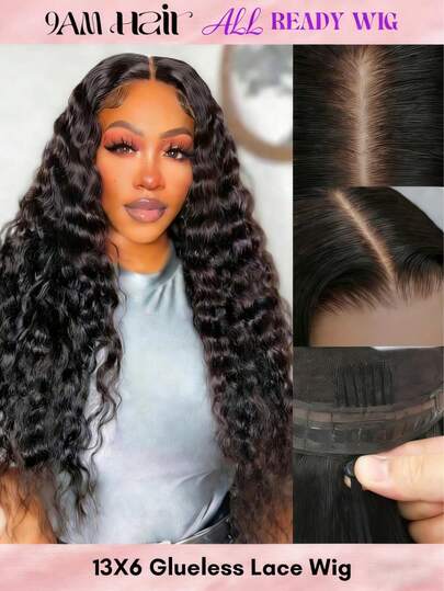 ALL READY WIG 抽绳假发帽,适合所有头型,无胶,13x6 深波浪假发,真人头发,预拔透明蕾丝漂白结,180% 密度真人假发,含婴儿头发,适合女士 - Natural Black - 查看 14