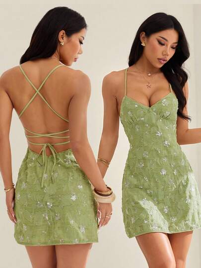 SHEIN PETITE 夏季女士节日服装露背亮片提花绿色度假迷你连衣裙,薄荷绿连衣裙 - 綠色 - 查看 1