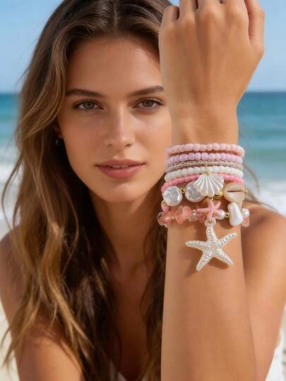 imoli 7件套时尚波西米亚海洋风多层玻璃珠、树脂海星和贝壳手链套装,适合作为沙滩派对首饰或送给女性的礼物。 - 粉色 - 查看 4