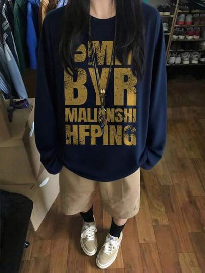 女士宽松卡通印花长袖棉质T恤,百搭春秋装 - 藏蓝色 - 查看 1