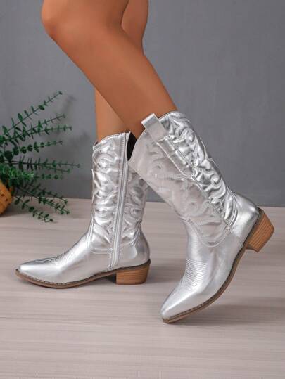 女士秋冬時尚銀色西部風格靴,休閒穿著 - 銀色 - 查看 4