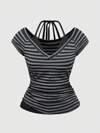 镂空不对称肩部T恤,时尚短袖镂空肩部上衣,女款