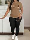 Maweii 2 件大码女式套装:拼色条纹字母徽标印花 T 恤和紧身裤,时尚休闲装