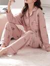 蝴蝶结爱心图案长袖睡衣套装 - 长袖纽扣领上衣和长裤,柔软缎面睡衣,可机洗,可外穿