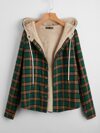SHEIN LUNE 秋冬格纹泰迪熊内衬按扣抽绳连帽大衣