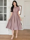 春夏新款纯色通勤时尚V领收腰大摆纽扣