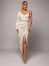 Silquee 优质毕业春夏“奢华亚麻布、慢慢来、永恒亚麻布”纯米色、杏色、自然白色亚麻女士时尚不对称领口褶皱修身上衣。