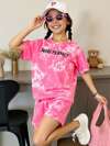 SHEIN 2 件套年轻女孩休闲可爱卡通动物印花彩色扎染短袖 T 恤和短裤套装,适合夏季