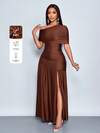SOLERSUN 春夏女装性感派对休闲度假棕色亮面面料单肩聚拢露肩领前开衩褶边针织长裙