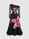 SHEIN MOD 黑色复古超大花卉印花网眼长袖修身长裙,单肩荷叶边设计,适合约会、派对、舞会、生日装、茶会等场合穿着