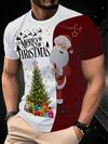 男士 3D 印花圣诞老人和圣诞快乐图案 T 恤 - 假日休闲圆领短袖,可水洗面料,白色和红色撞色街头风上衣