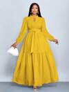 SOLERSUN 大码女装纯色宽松休闲立领前开衩水滴扣高端设计长袖腰带修身A字长裙,优雅舒适休闲时尚通勤气质连衣裙,新款,日常穿着,新年、秋季、冬季、约会、圣诞节等场合皆宜,女装