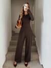 Easowa 2件套女士修身长袖T恤和阔腿裤休闲运动家居服套装,咖啡棕色棕色两件套女士阔腿裤套装长袖两件套棕色阔腿裤套装女士女士棕色裤装