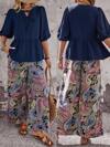 Rusticease 女士休闲优雅 V 领不对称下摆长袖宽松衬衫和阔腿裤两件套,复古印花秋装