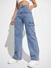 SHEIN EZwear 高腰翻盖口袋侧工装牛仔裤,女士休闲纽扣、口袋、拉链高腰直筒长款轻洗工装裤常规版型女士牛仔裤,春/秋,休闲日常穿着